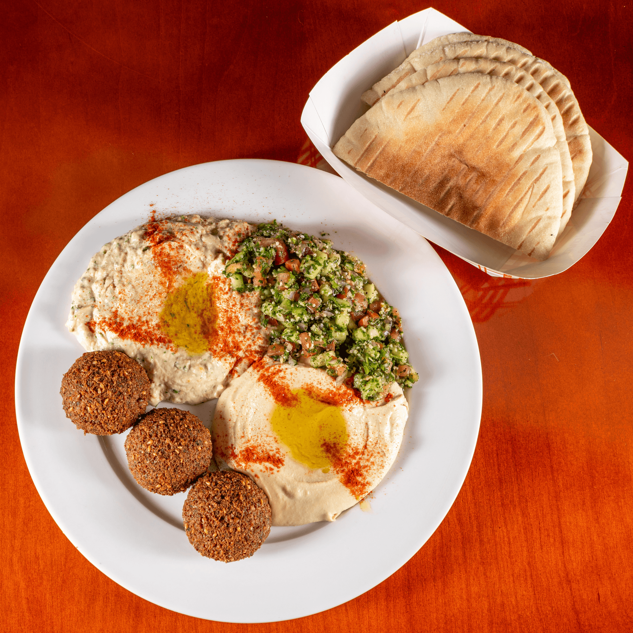 Hummus and Baba Ghanouj sprinkled with paprika and drizzled with organic extra virgin olive oil. Tabuli Salad (contains cracked wheat) and 3 Falafel (contains sesame seeds). Includes 2 warm pitas cut in half and a Tahini sauce cup.