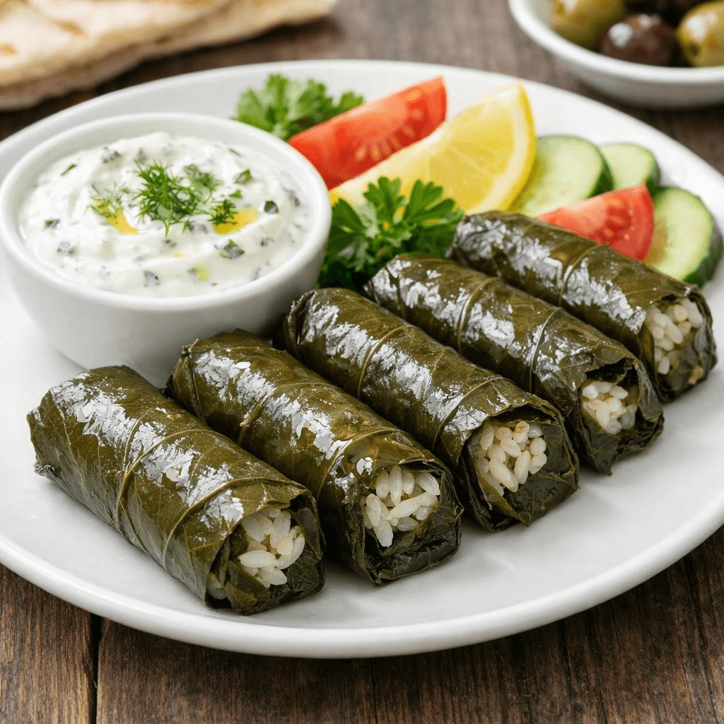 6 Veggie grape leaves stuffed with rice. Served cold with a Tzatziki sauce cup.