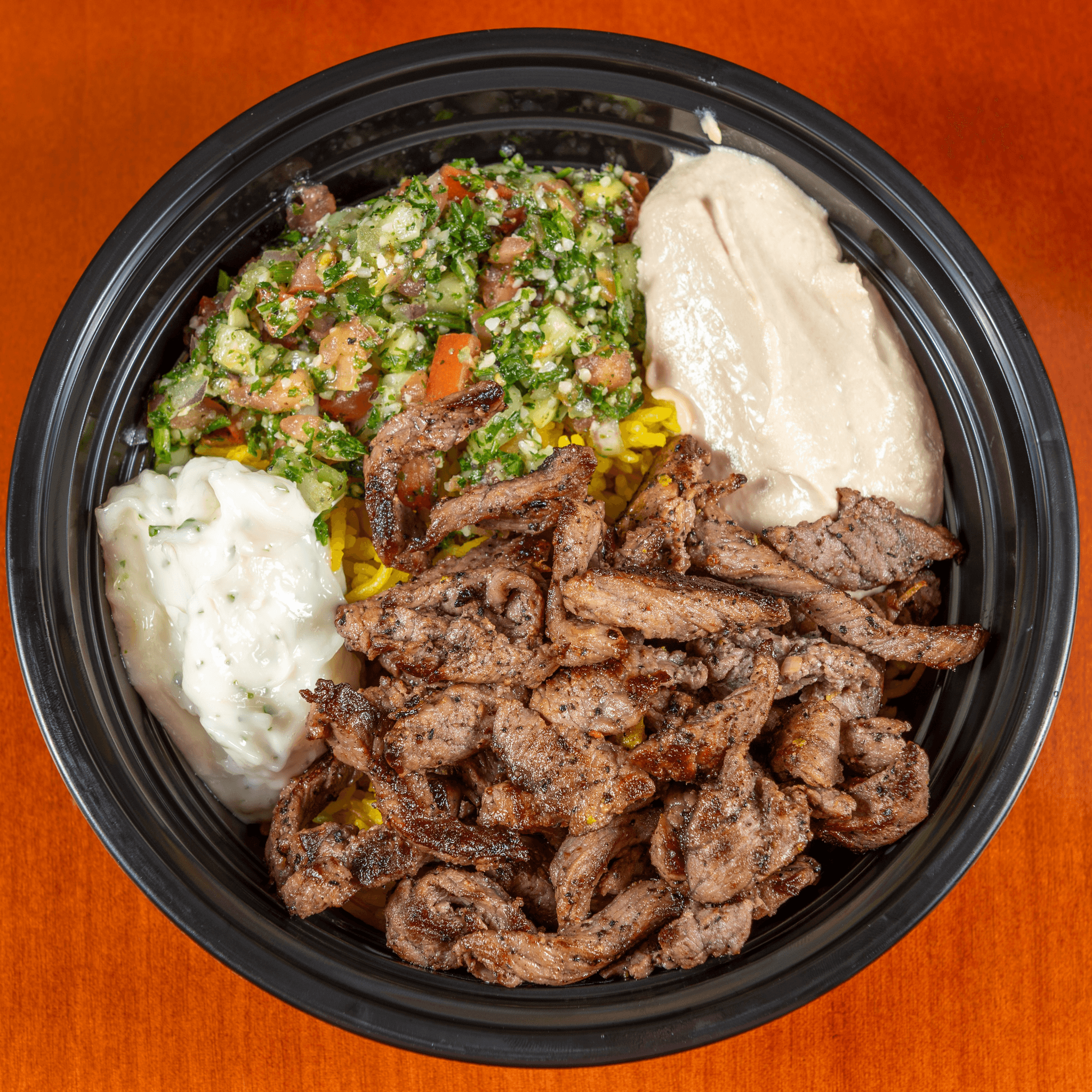 Beef Shawarma & Rice Pilaf with a scoop each of Hummus, Garlic Sauce, & Tabuli Salad.