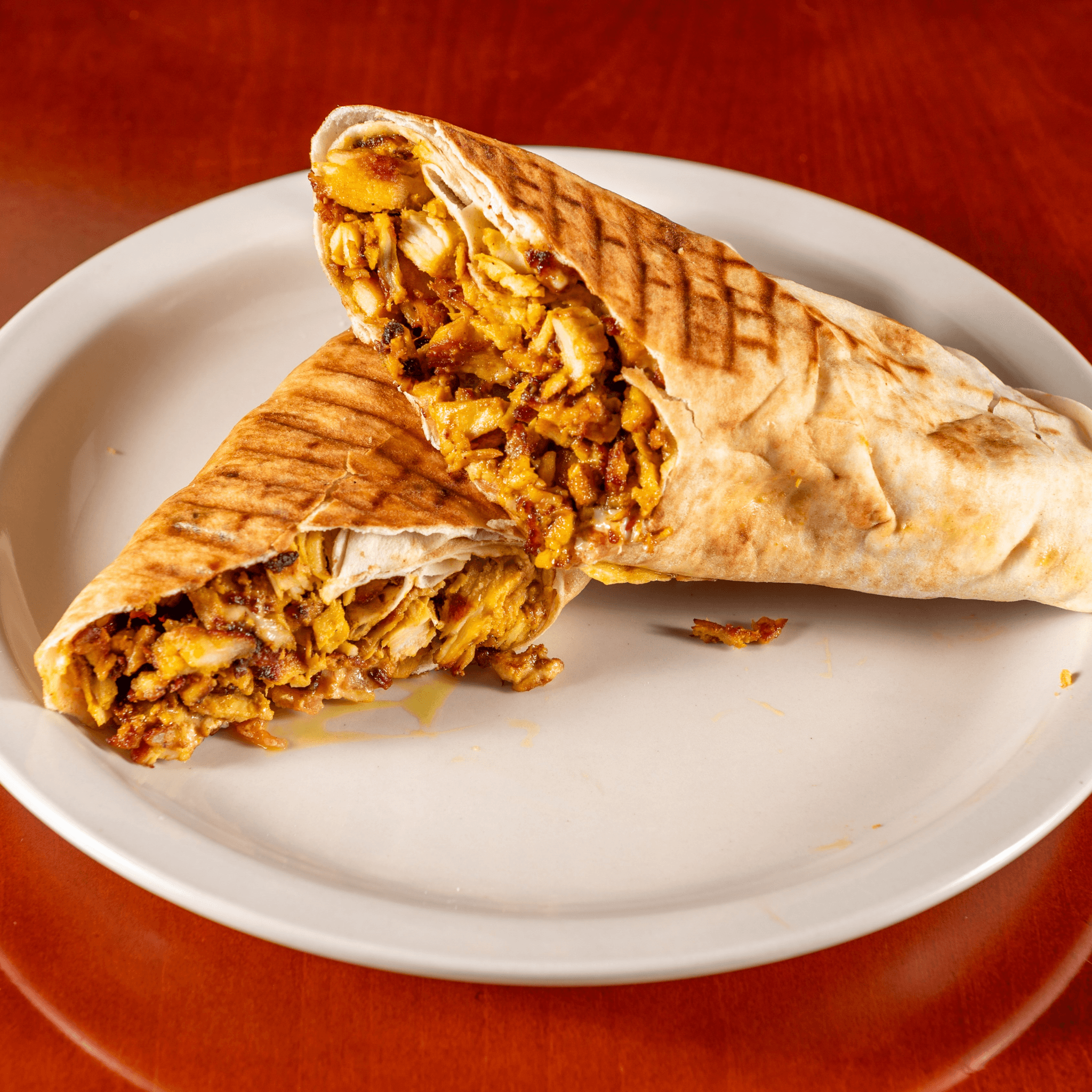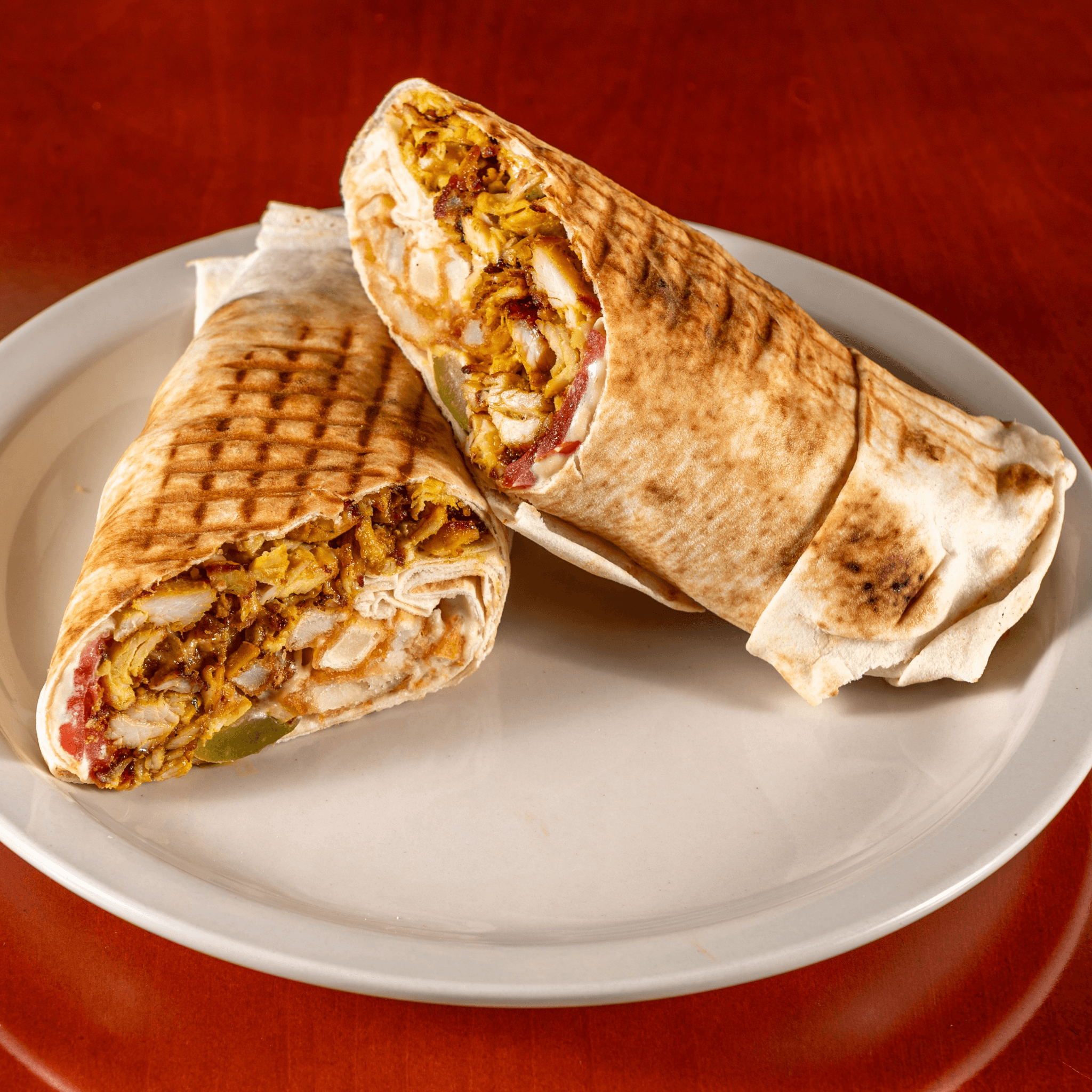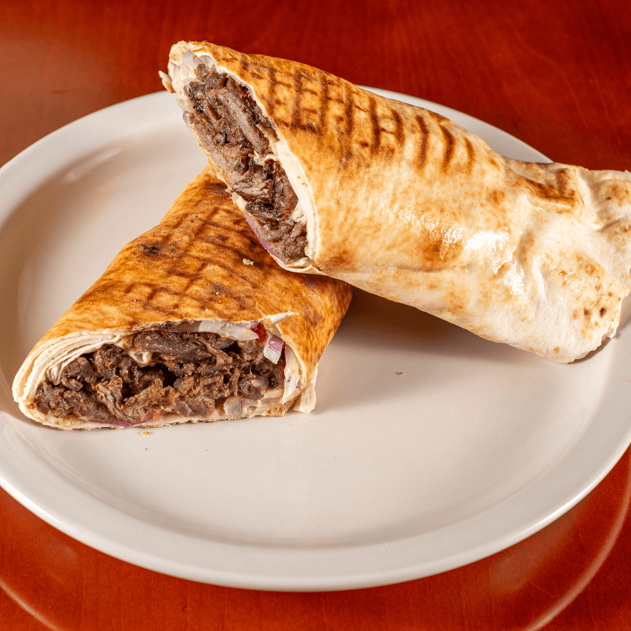 Thick strips of our Halal Lamb Gyro meat grilled to a crisp with tomato slices, red onion, and Tzatziki wrapped up in Thin Lebanese Pita and grilled.