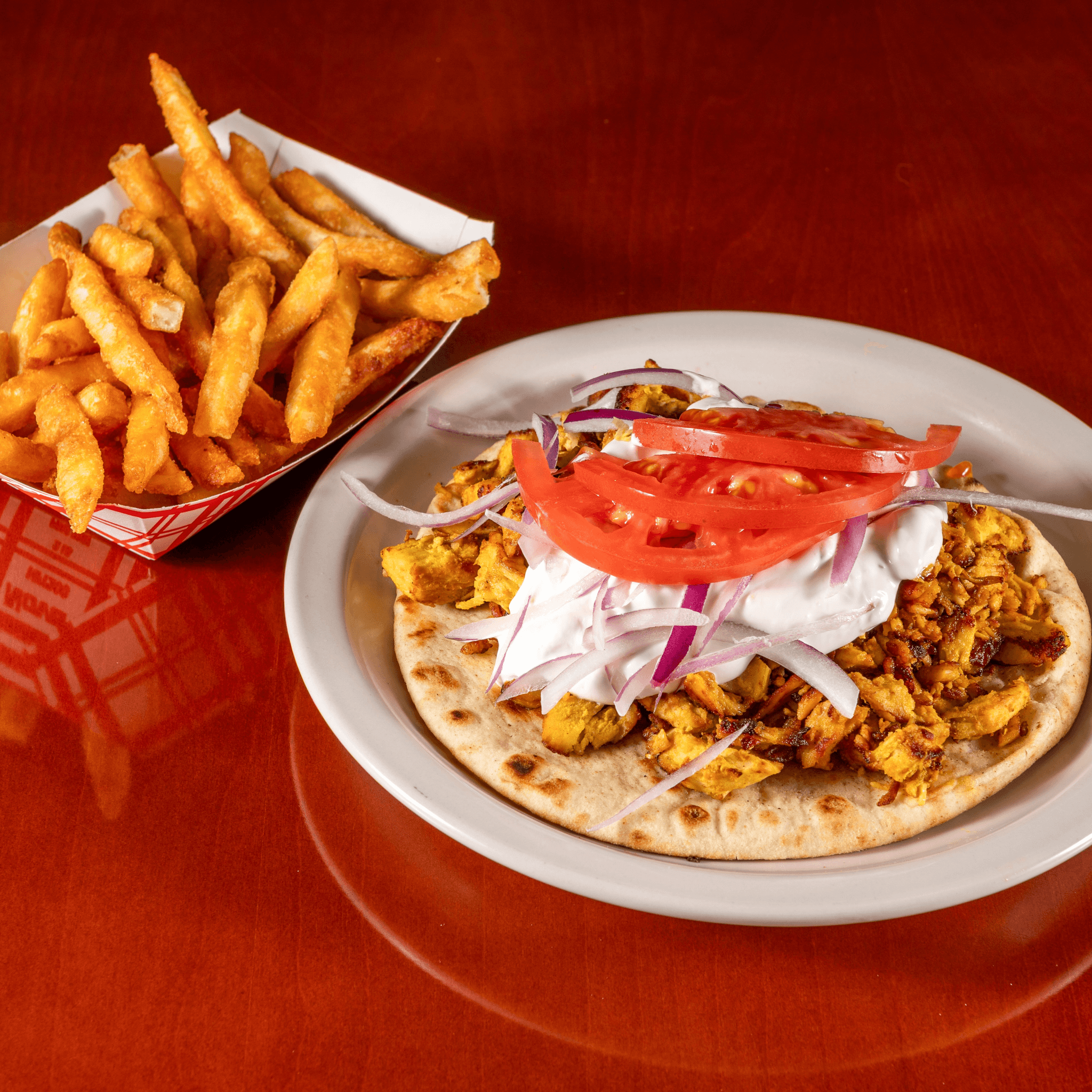 A generous dinner size portion of our Chicken Shawarma piled on a warm Grecian Pita topped with juicy tomato slices, red onions, and tzatziki sauce. Includes Grilled Green Pepper & Tomato Wedges. Accompanied by your choice of one side from the options of our house-made rice pilaf, seasoned french fries, or grilled green pepper & tomato wedges.
