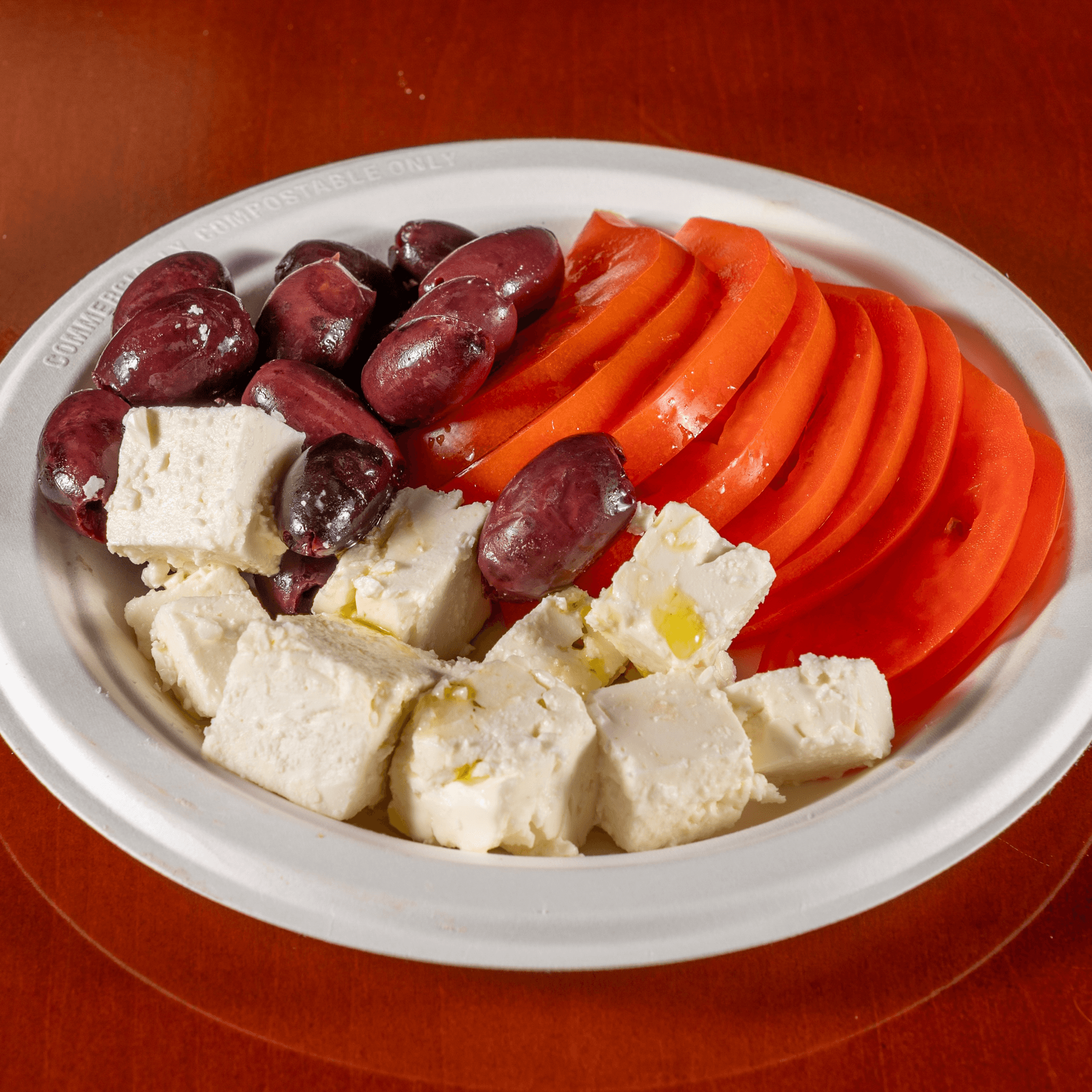 Feta, Kalmata Olives, & Tomato Slices drizzled with Organic Extra Virgin Olive Oil