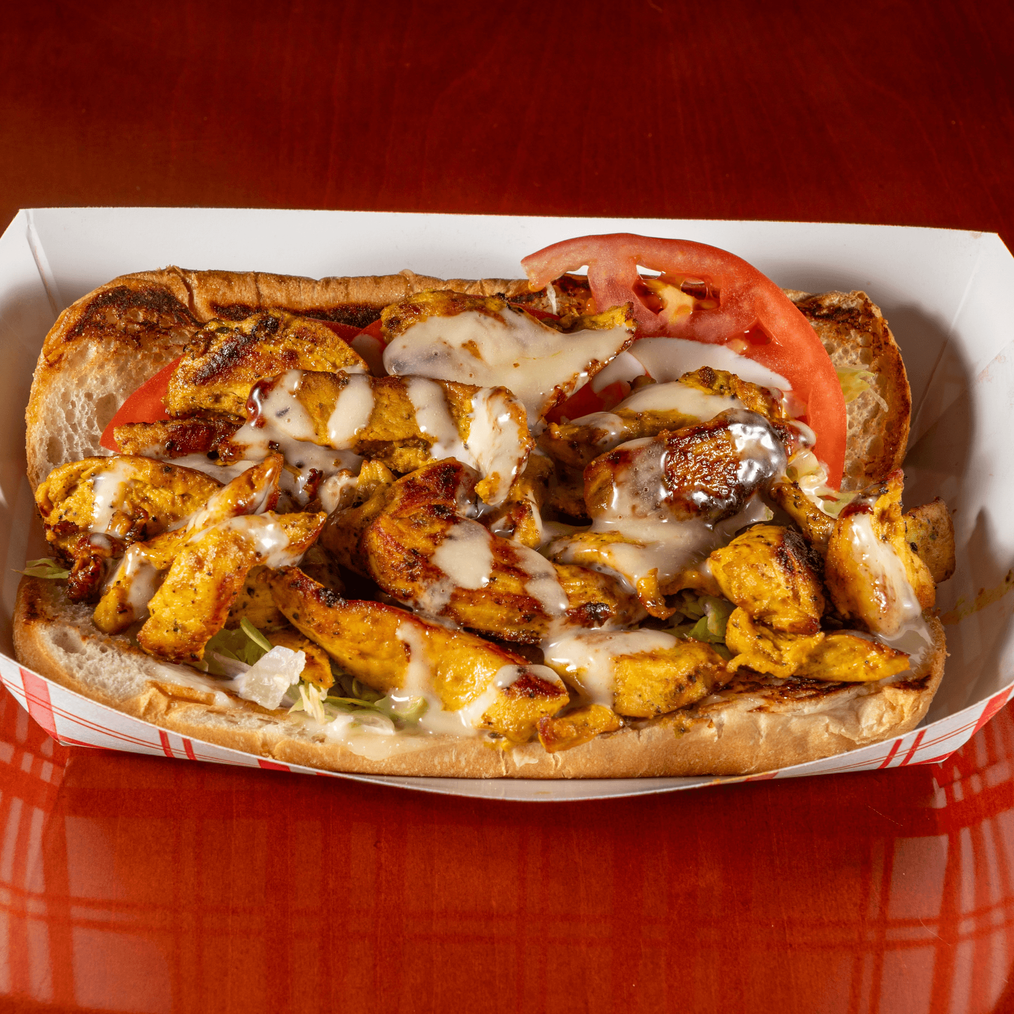 Our Juicy Halal Chicken Kabab pieces topped with Shredded Lettuce, Tomato Slices, Red Onion, Mayo, and our Creamy House-Made Honey Mustard Sauce on French Bread. Try it on our mouth watering Garlic Bread.