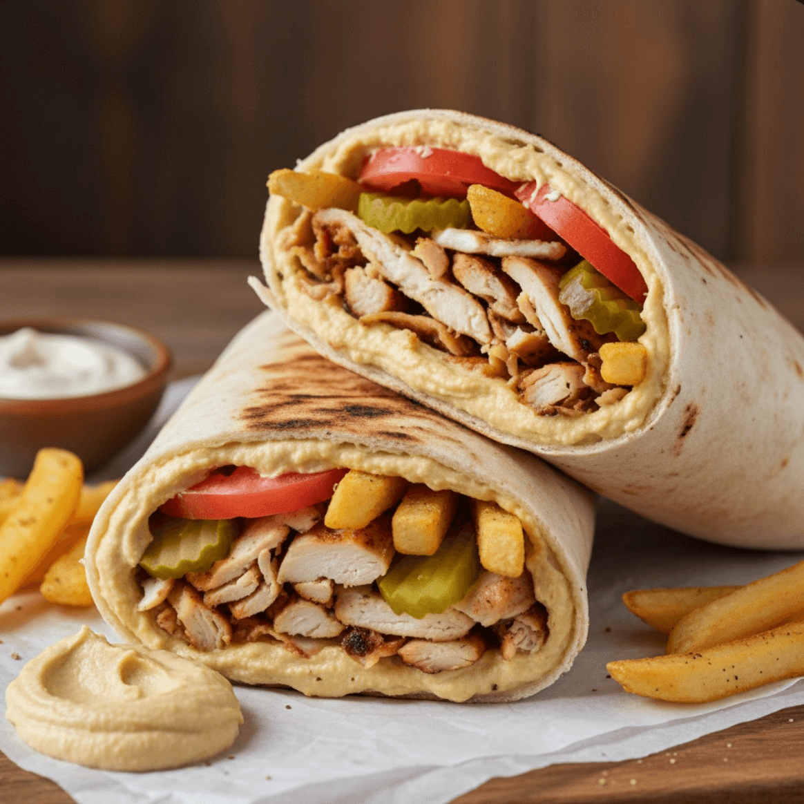 Chicken Shawarma with Hummus, tomato slices, pickle spears, Fries, and Garlic Sauce. The French Fries are INSIDE the wrap!