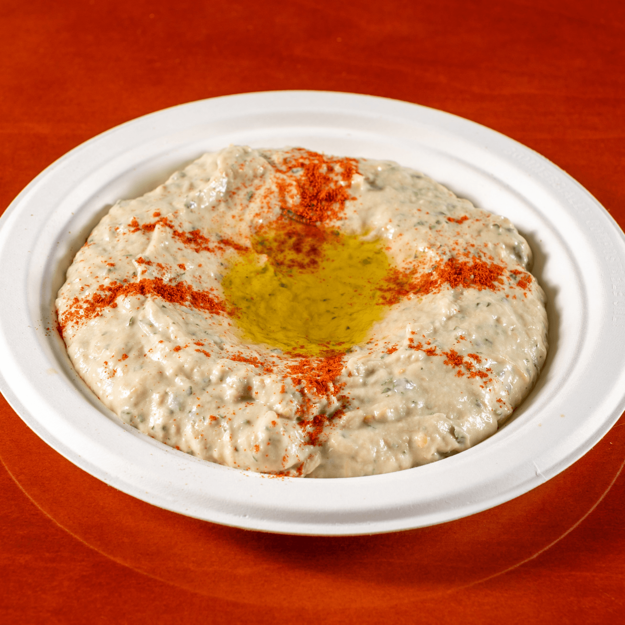 House-Made Creamy Roasted Eggplant dip sprinkled with paprika and drizzled with organic extra virgin olive oil. Small size includes 1 pita. Regular size includes 2 pitas. 7” Bowl includes 4 pitas. 9” Bowl includes 6 pitas. Pitas are served warm and cut in half.