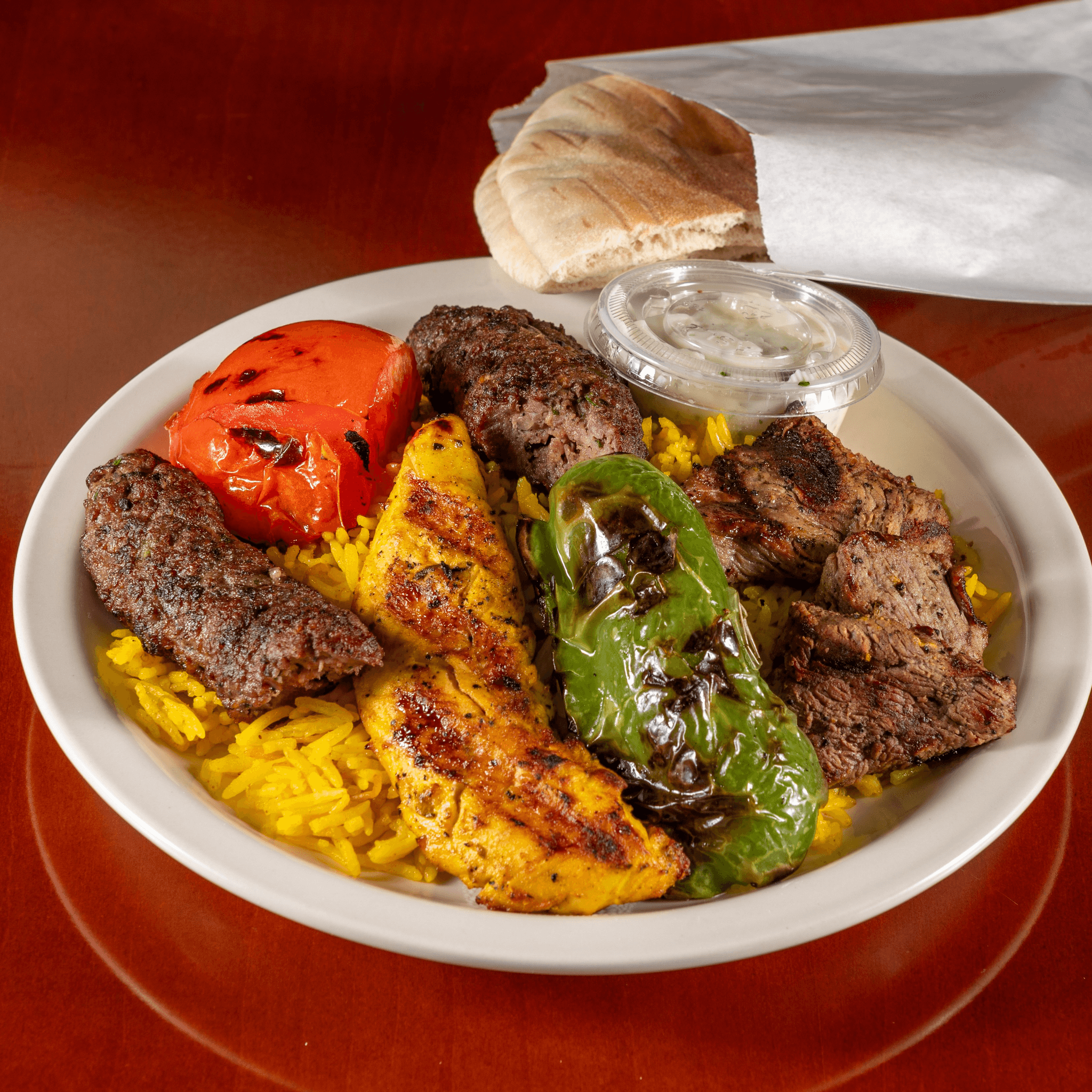 2 Chicken Kabob Tenderloins, 4 Beef Kabob Cubes, 1 Beef Kifta Log, Beef & Chicken Shawarma all together upon Rice Pilaf accompanied by Grilled Green Pepper & Tomato Wedges. Includes a warm pita cut in half, Garlic and Tahini sauce.