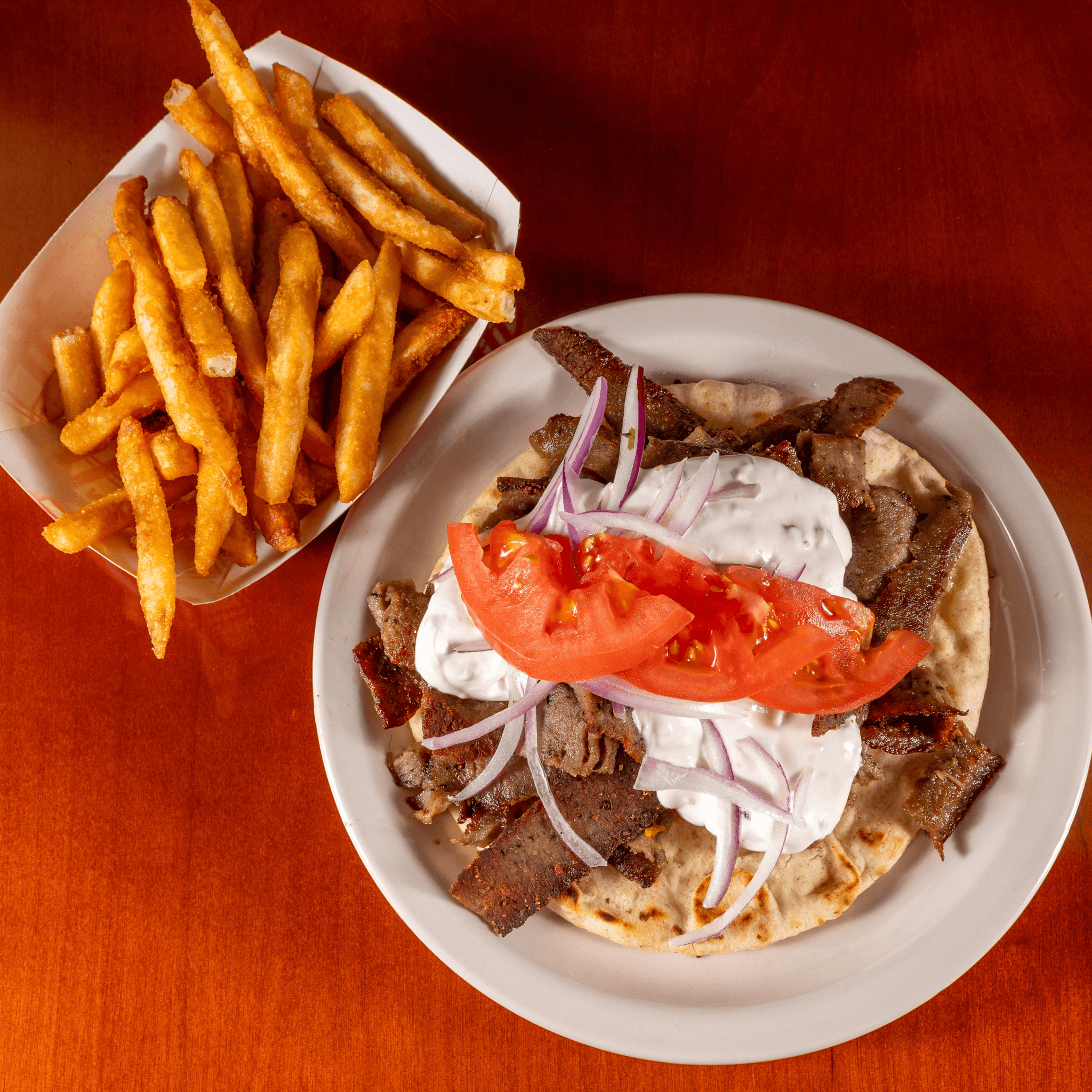 A generous dinner size portion of Halal Lamb Gyro layered upon a warm Grecian Pita topped with Tzatziki sauce, juicy tomato slices and red onion. Includes Grilled Green Pepper & Tomato wedges. Accompanied by your choice of one side from the options of our house-made rice pilaf, seasoned french fries, or a second set of grilled green pepper & tomato wedges.