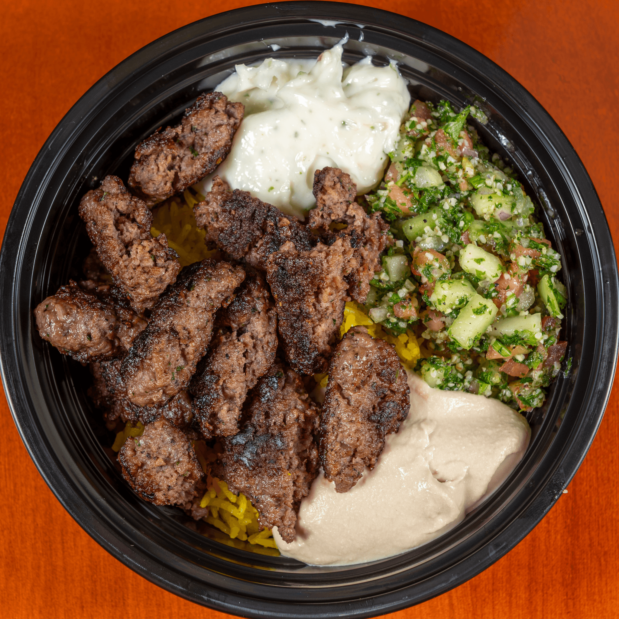 Thick slices of Crispy Lamb Gyro Meat (*contains Gluten) & Rice Pilaf with a scoop each of Hummus, Garlic Sauce, and Tabuli Salad.