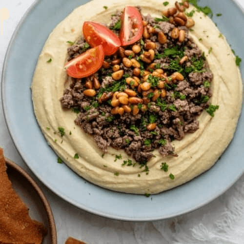 A Bed of Hummus or Baba Ghanouj topped with Beef Shawarma and a dallop of Tzatziki Sauce.