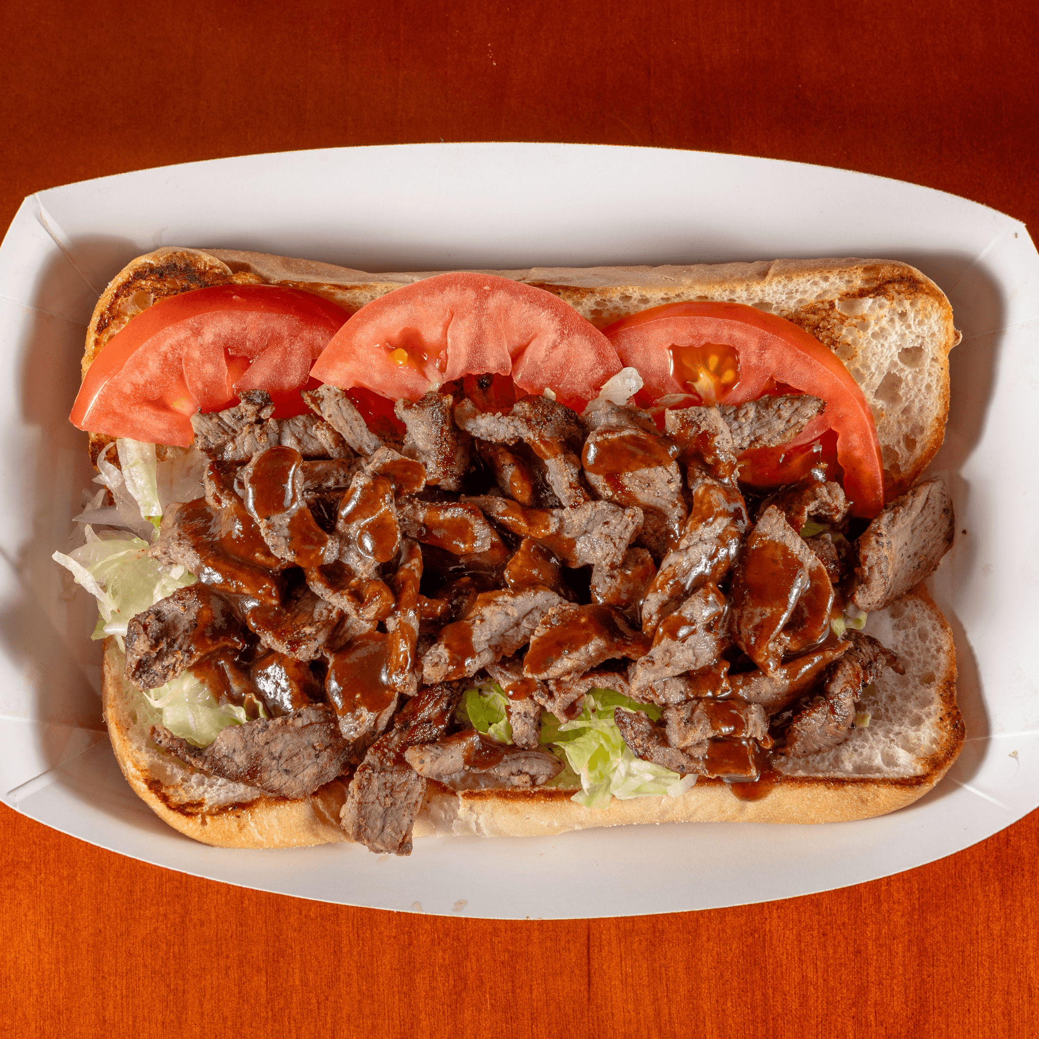 Made with our delicious Halal Beef Kabab strips topped with Shredded Lettuce, Tomato Slices, Red Onion, and steak sauce on French Bread. Try it on our mouth watering Garlic Bread.