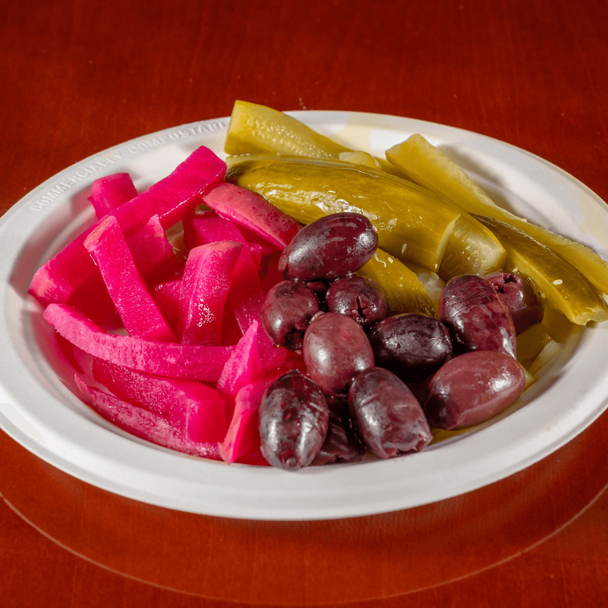 Pickled Turnips, Pickle Spears, & Kalamata Olives drizzled with Organic Extra Virgin Olive Oil.